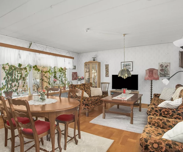 Bostadshuset är uppfört 1964 och erbjuder ca 99,6 kvm boarea i ett plan samt oinredd källare med ytterligare utrymme. Planlösningen rymmer tre sovrum, rymligt vardagsrum och ett funktionellt kök med plats för matbord. Här finns även badrum, separat WC samt goda förvaringsmöjligheter. Källaren ger extra ytor för förvaring, hobby eller framtida utvecklingsmöjligheter. Invändigt finns renoveringsbehov, vilket ger nästa ägare möjlighet att skapa ett hem helt efter egen smak.