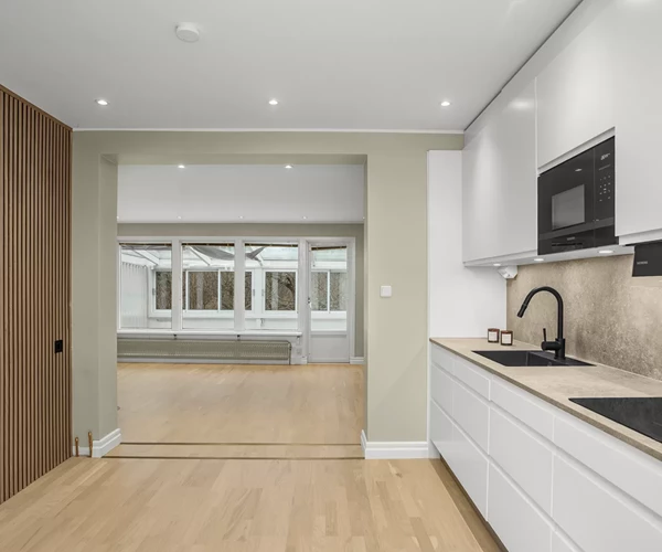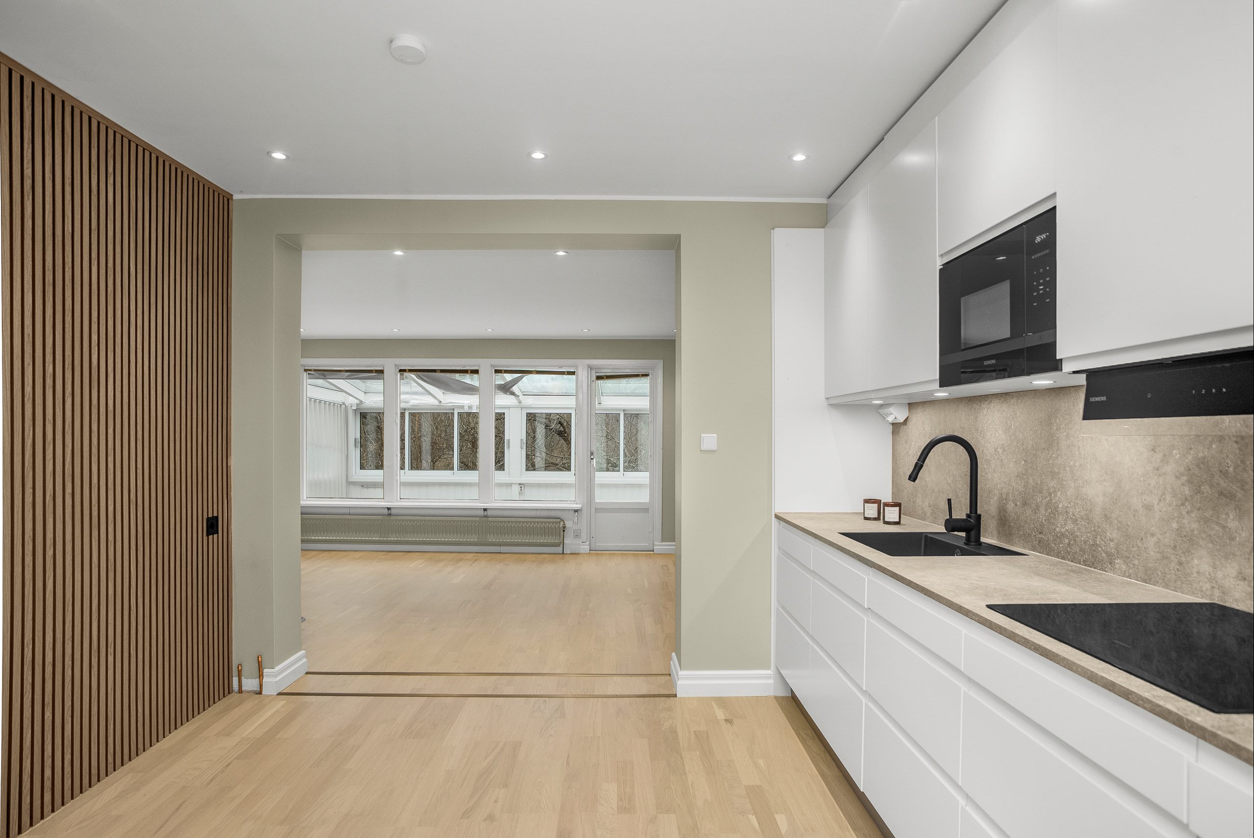 Huset har genomgått omfattande renoveringar och erbjuder nu en modern och stilren boendemiljö. Köket är nytt och kommer från HTH, utrustat med Siemens vitvaror samt spotlights som skapar en ljus och inbjudande känsla. Genomgående parkettgolv och belysning med spotlights i hallen, kök och vardagsrum bidrar till en exklusiv helhet.
