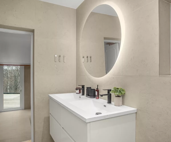 Badrummet är totalrenoverat med nya rör, nya ytskikt, inredning från HTH, samt bytt golvbrunn, vilket ger en fräsch och modern standard. Uppvärmningen sker via en luft–vattenvärmepump från 2017, som ger både komfort och energieffektivitet.