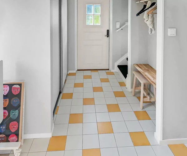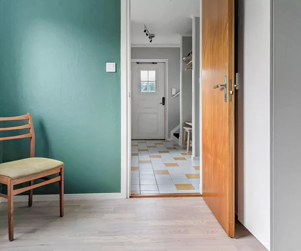 Redan i entrén möts man av klinkergolv med vattenburen golvvärme, vilket ger ett välkomnande och praktiskt första intryck. Här finns också ett smakfullt badrum med moderna materialval, infällda spotlights och påkostad inredning – såsom badkar med glasvägg, dubbel kommod, vägghängd toalett, spegel och handdukstork