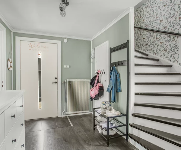 Huset värms upp via energieffektiv bergvärme, vilket ger låga driftkostnader och ett bekvämt boende året om.