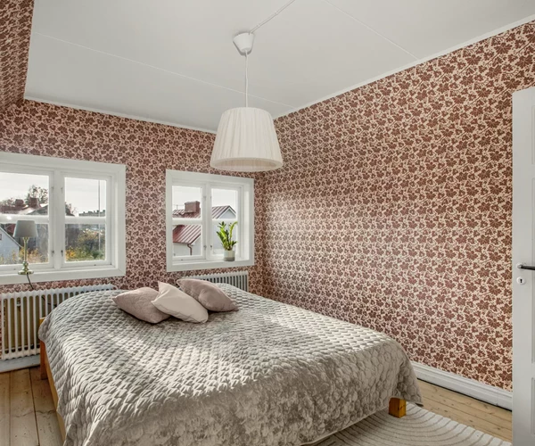 På övervåningen finns två sovrum, där det ena utgör ett genomgångsrum som leder vidare till det andra. Här uppe finns även den andra kakelugnen samt utsikt över den lummiga trädgården. Källaren erbjuder praktiska ytor med tvättmöjligheter och gott om förvaring.