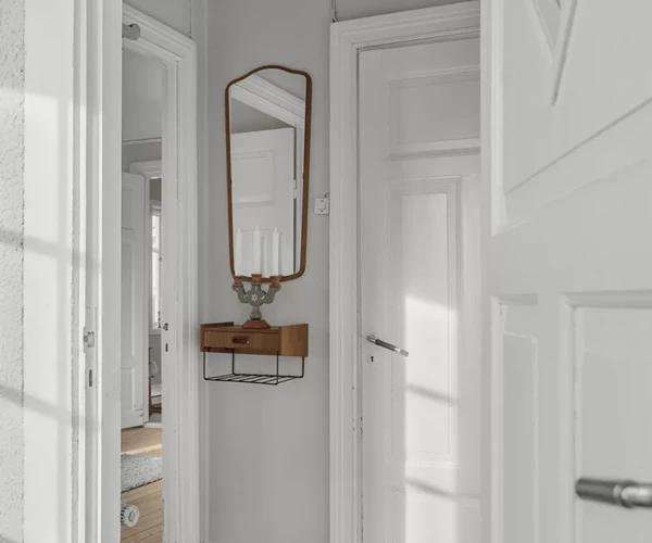På entréplan finns ett sovrum och två rymliga vardagsrum med härlig takhöjd och fint ljusinsläpp. Den nuvarande planlösningen erbjuder generösa sociala ytor, och för den som önskar en modernare lösning finns möjlighet att i framtiden flytta köket till ett av vardagsrummen för en mer öppen och samtida planlösning. Det befintliga badrummet består idag av en duschkabin som fungerar bra, men på sikt finns behov av att modernisera och skapa ett mer komplett och tidsenligt badrum.