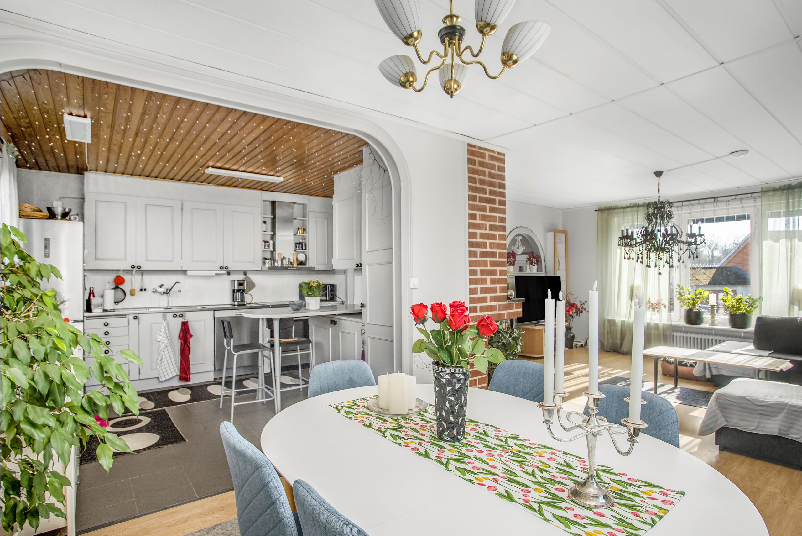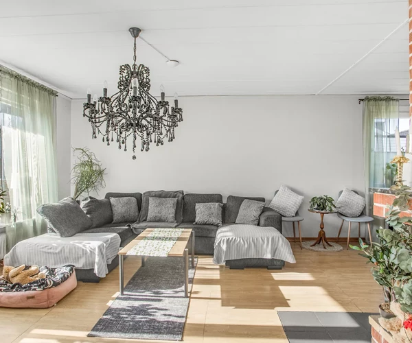 Vardagsrummet är rymligt och har plats för både soffgrupp och matsalsmöbel. Här finns bra möjligheter att skapa en trivsam samlingsplats för både vardag och umgänge.